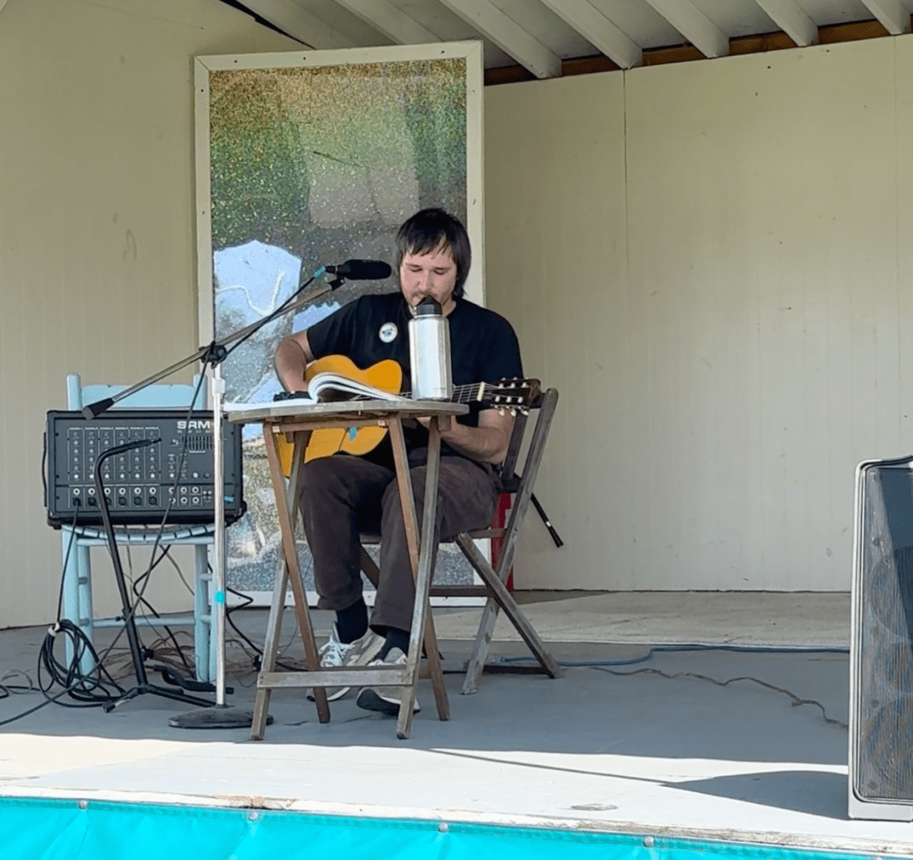 My partner captured this minute and a half of my performance at La Kermesse in June. It was a hot summer day and the breeze on those flags was not reaching us! She captured other songs, but this was our favorite—Neil Young’s “Tell Me Why,” based on his version from Live at Massey Hall 1971.